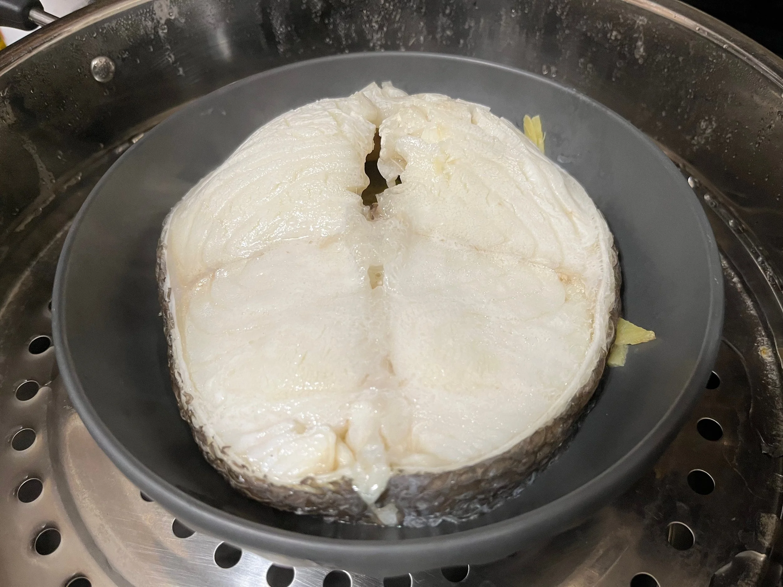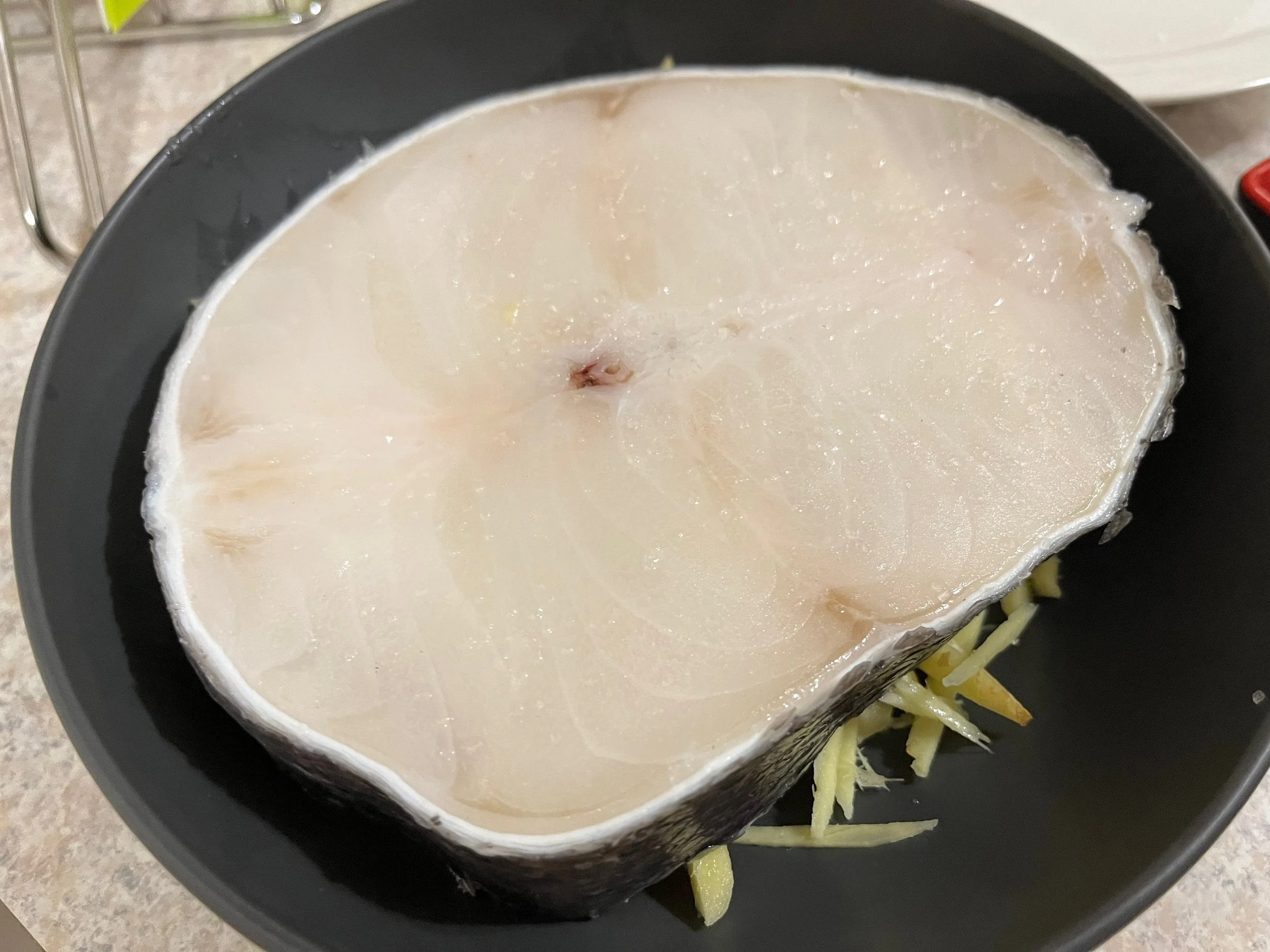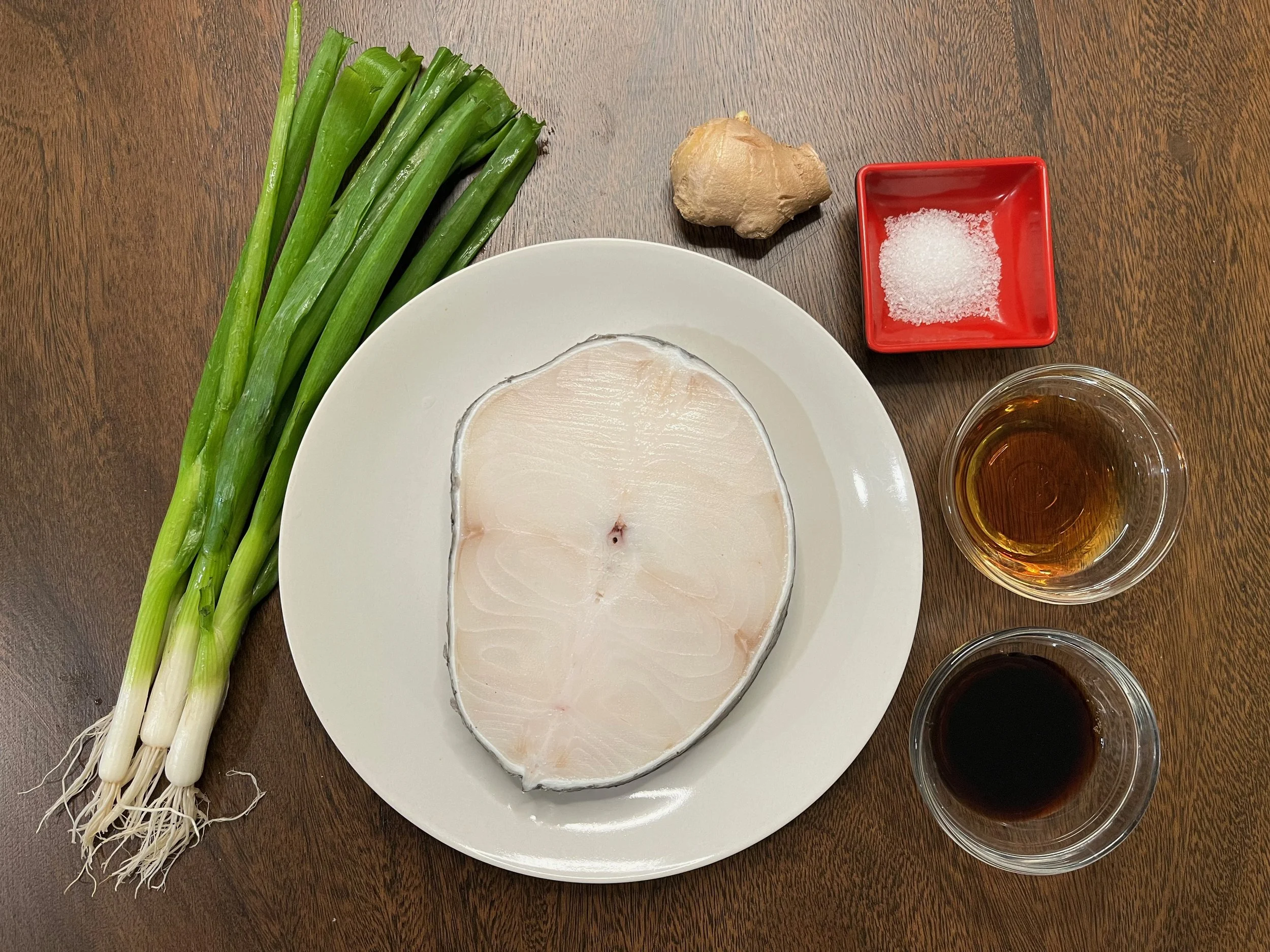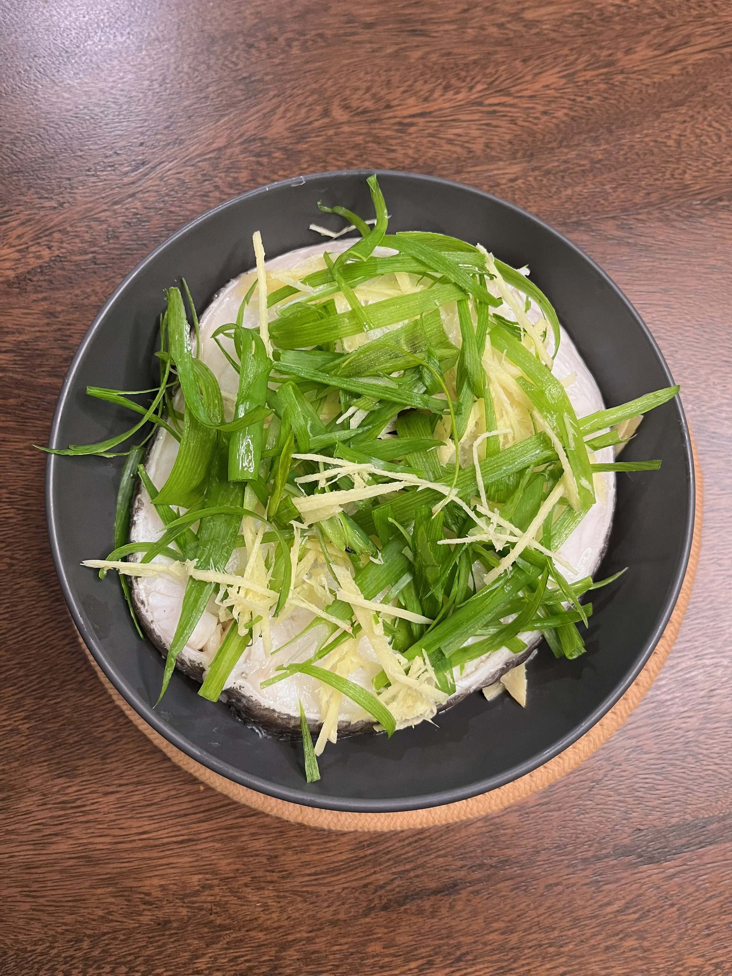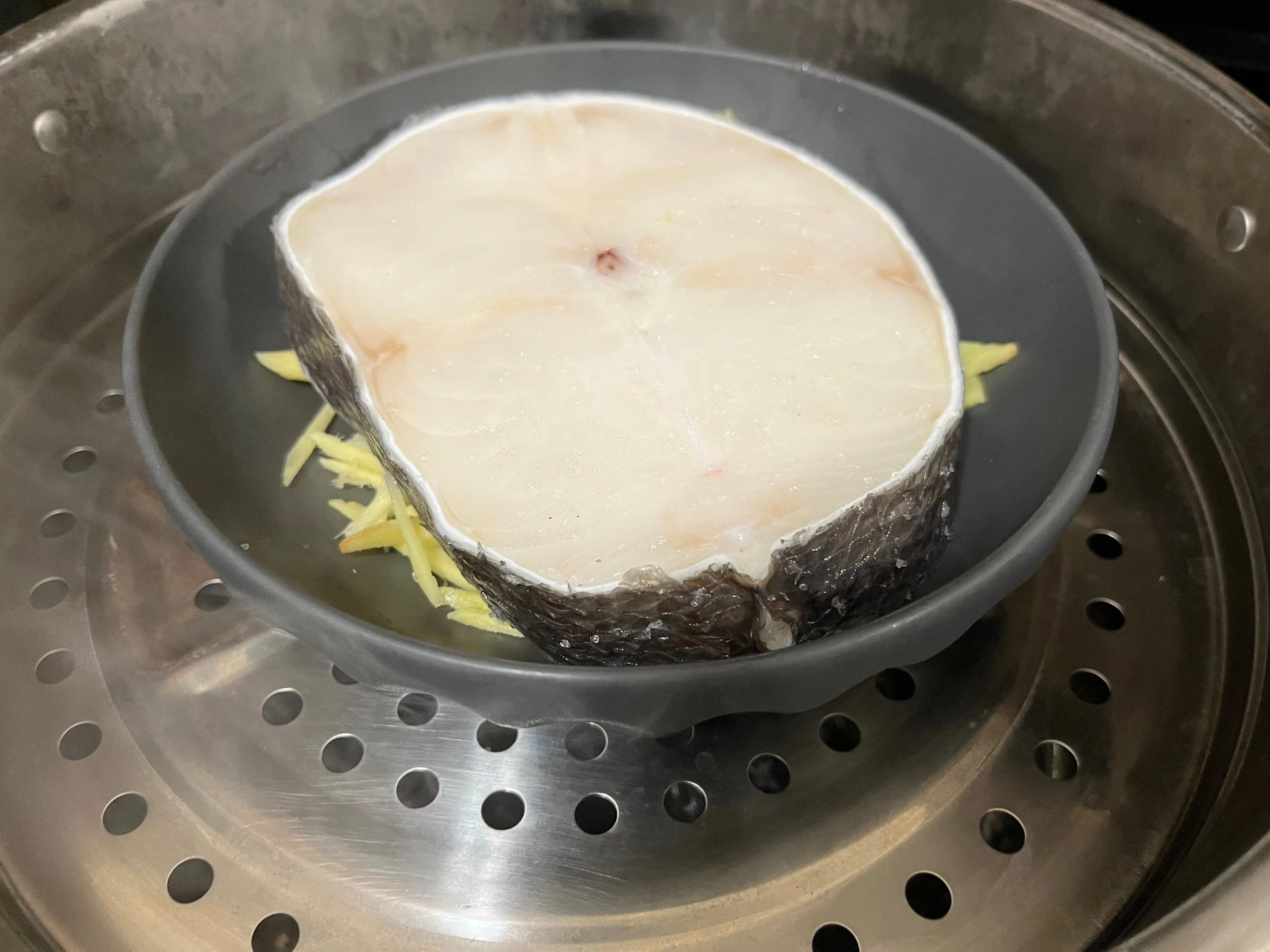 3. Lay the scallion whites on a plate capable of fitting in your steamer, along with ½ of the julienned ginger, and put the fish steak on top of the scallion whites and ginger.