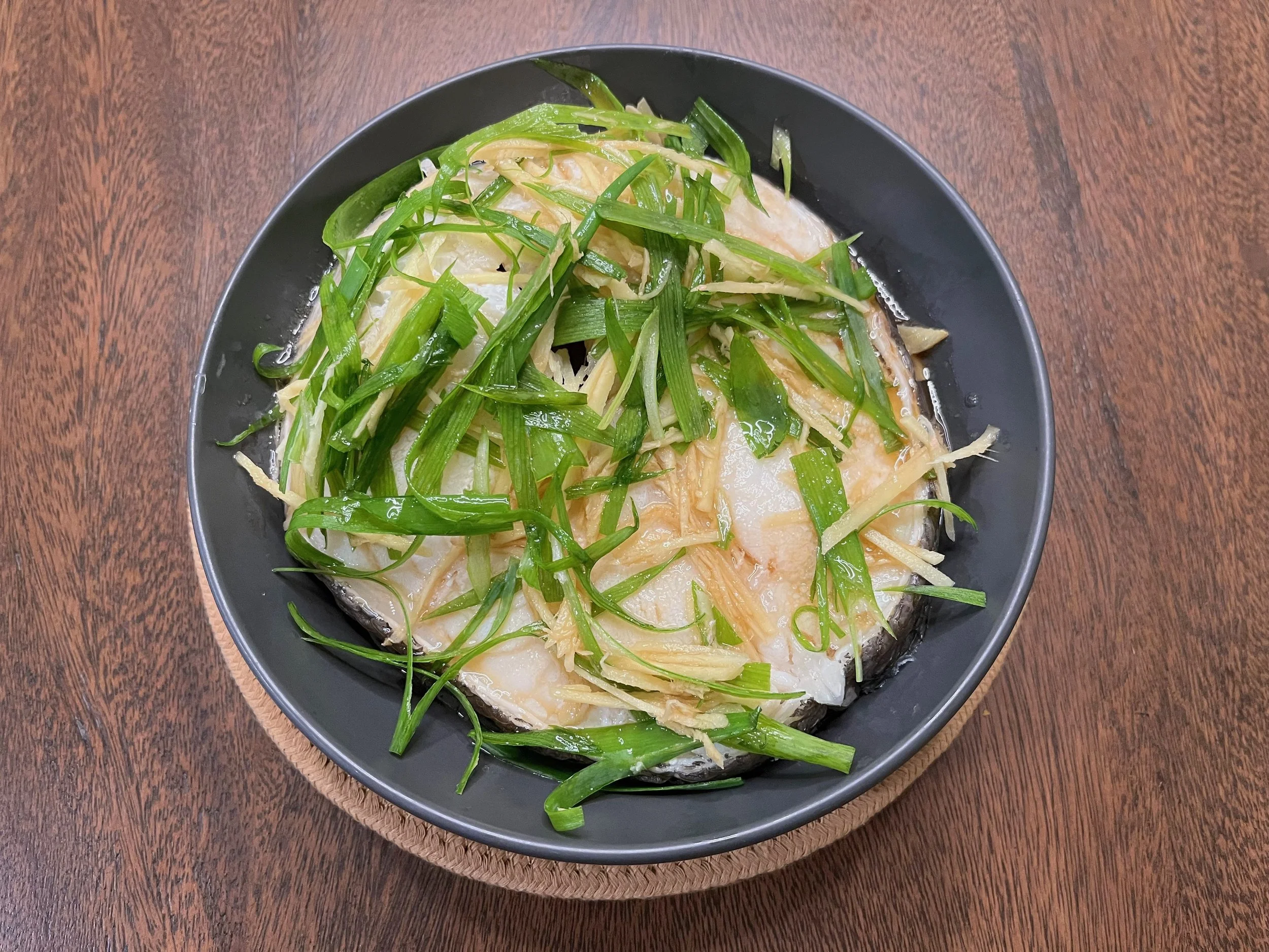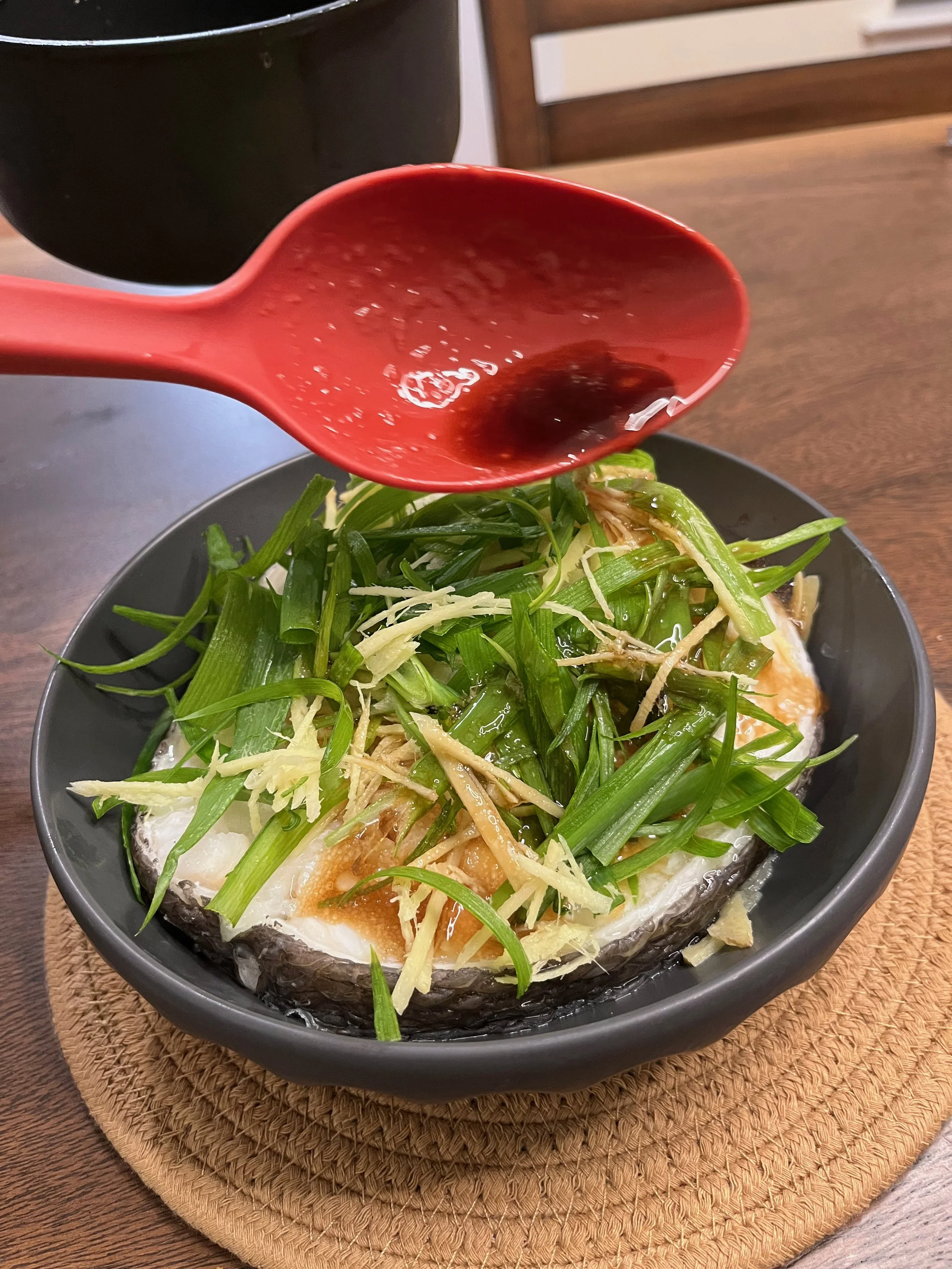 7. Carefully remove the fish from the steamer, pile on the julienned scallion greens and remaining julienned ginger, and drizzle over the sauce.