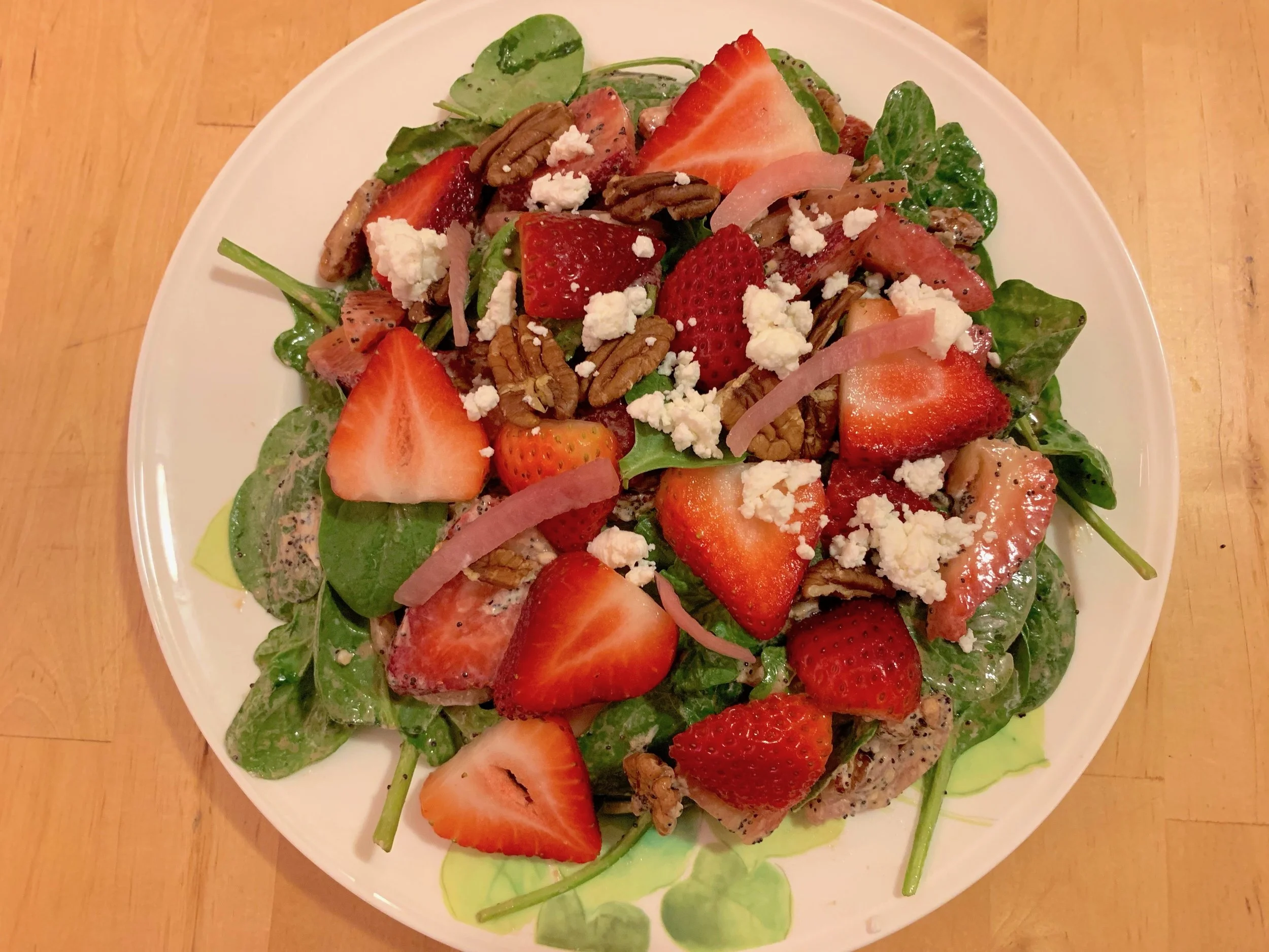 When strawberry season rolls around [1], one of my favorite applications of the fruit is in salad. This light salad combines spinach with strawberries and pecans, and is dressed with a balsamic poppy seed vinaigrette.