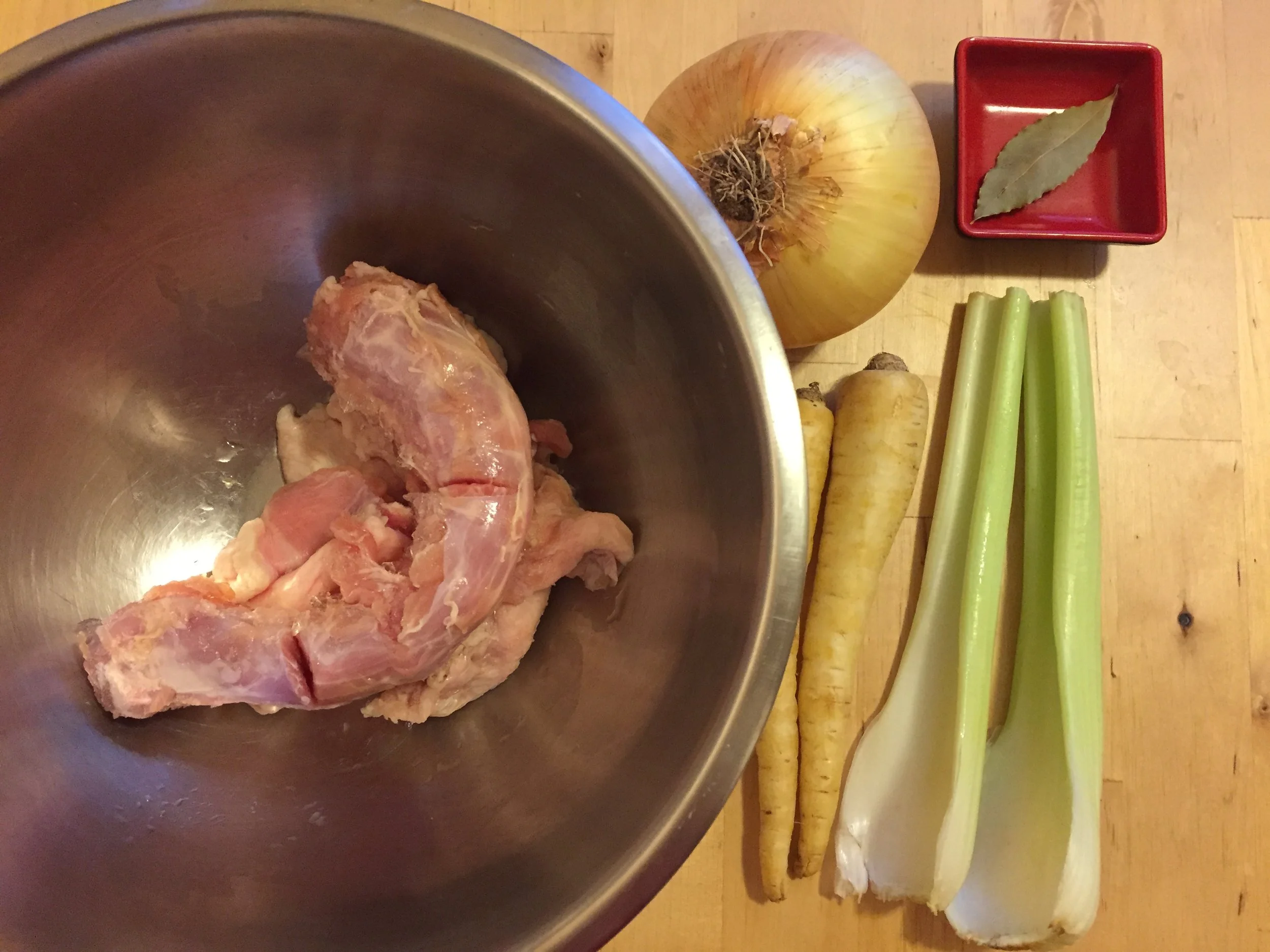 2. Roughly chop the onion, celery, and carrots, and add them to the pot, together with a bay leaf. Cover with water and bring to a boil.