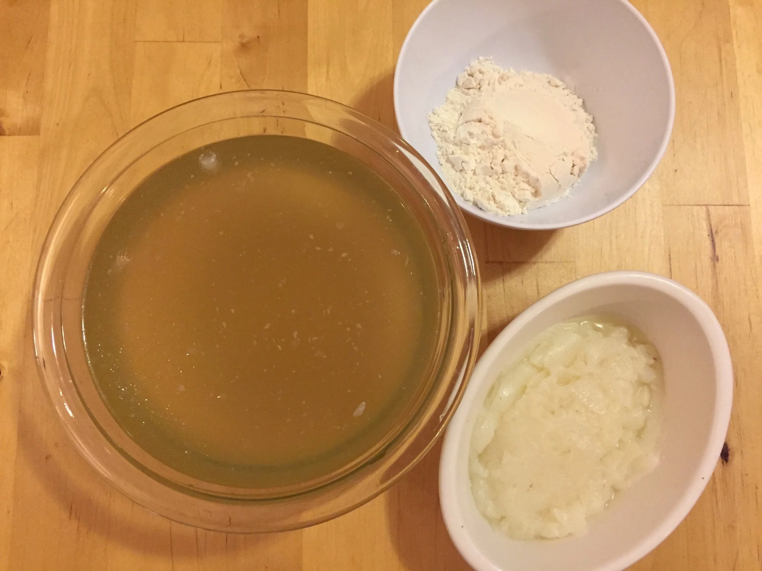 After 90 minutes, we should have successfully extracted nearly all the flavor and fat from our ingredients. Strain the stock, season with salt and pepper to taste, and chill it in the refrigerator. I like to do this the day before service, but you really only have to chill sufficiently for the fat to separate and solidify, which will take about 3 hours.