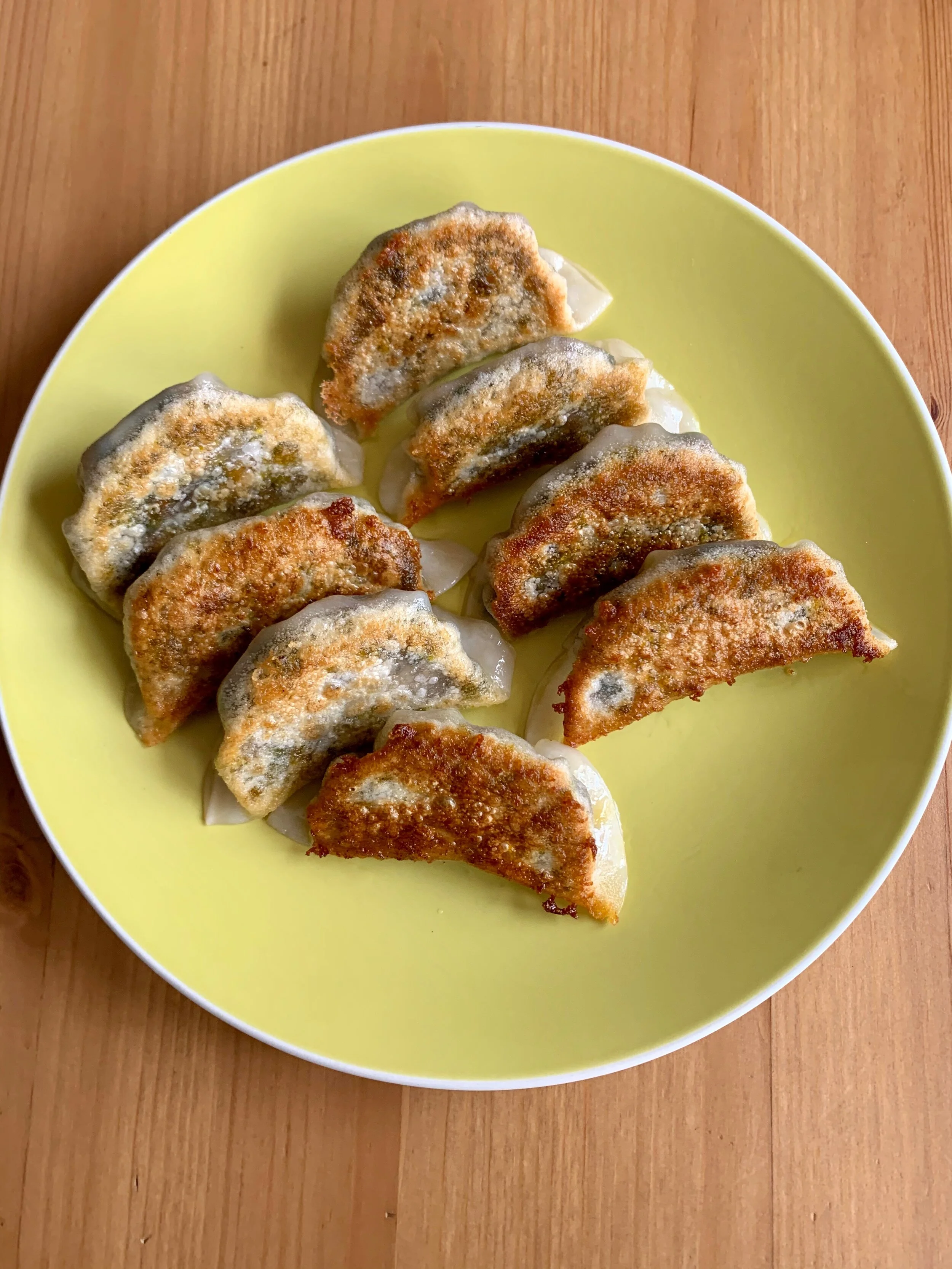 3. When the remaining water, oil, and flour from the dumplings begin to form a thick liquid, remove the lid and swirl the liquid around the dumplings. Let the dumplings fry until crisp on the bottom—about 2-3 minutes.