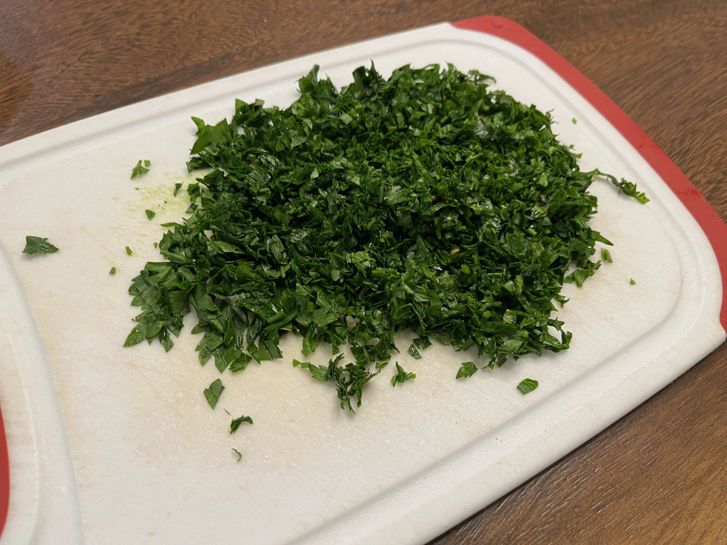 Begin by finely mincing the fresh parsley. If there are any tough stalks, pick the parsley leaves off of the stalks before mincing them. Crush the garlic or finely mince it, and set both the parsley and garlic aside.