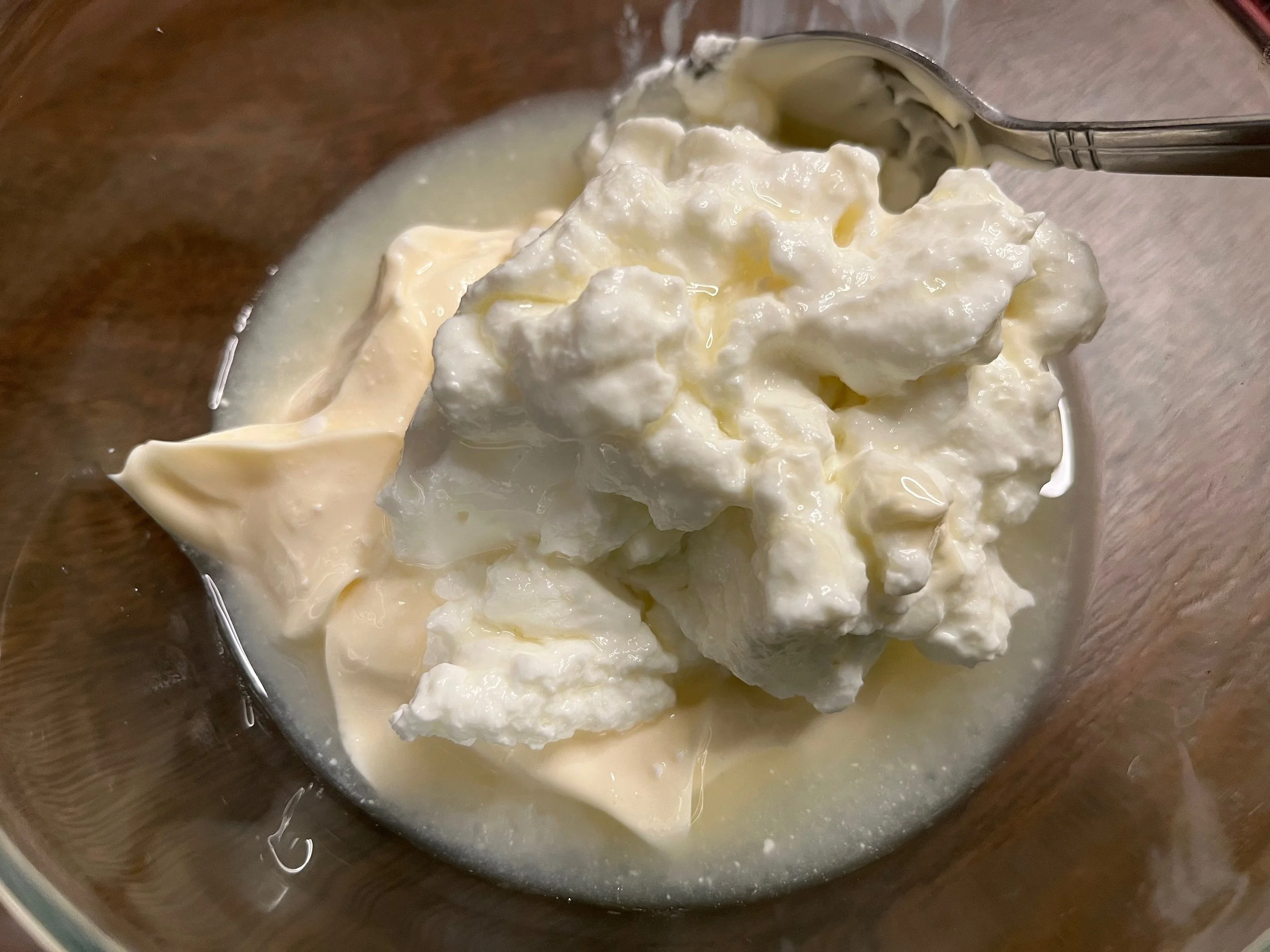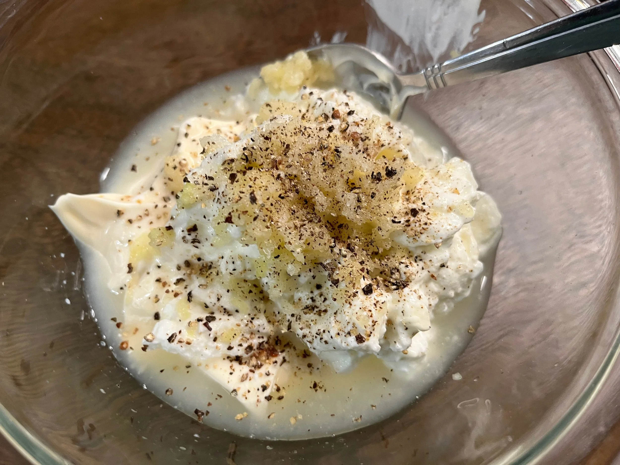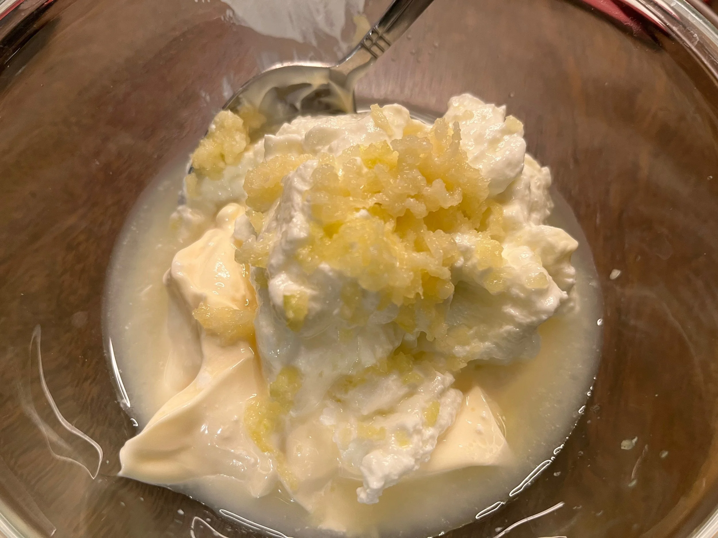 2. In a mixing bowl, combine the plain Greek yogurt, mayonnaise, and the juice of ½ a lemon.