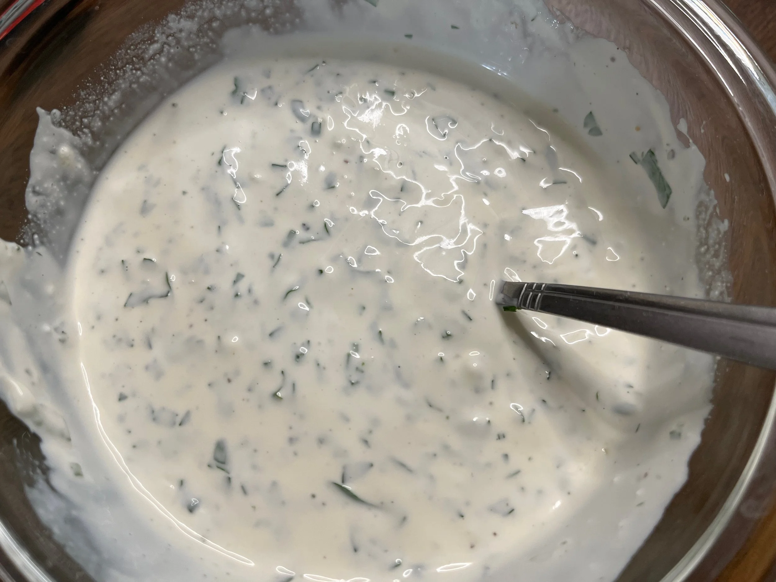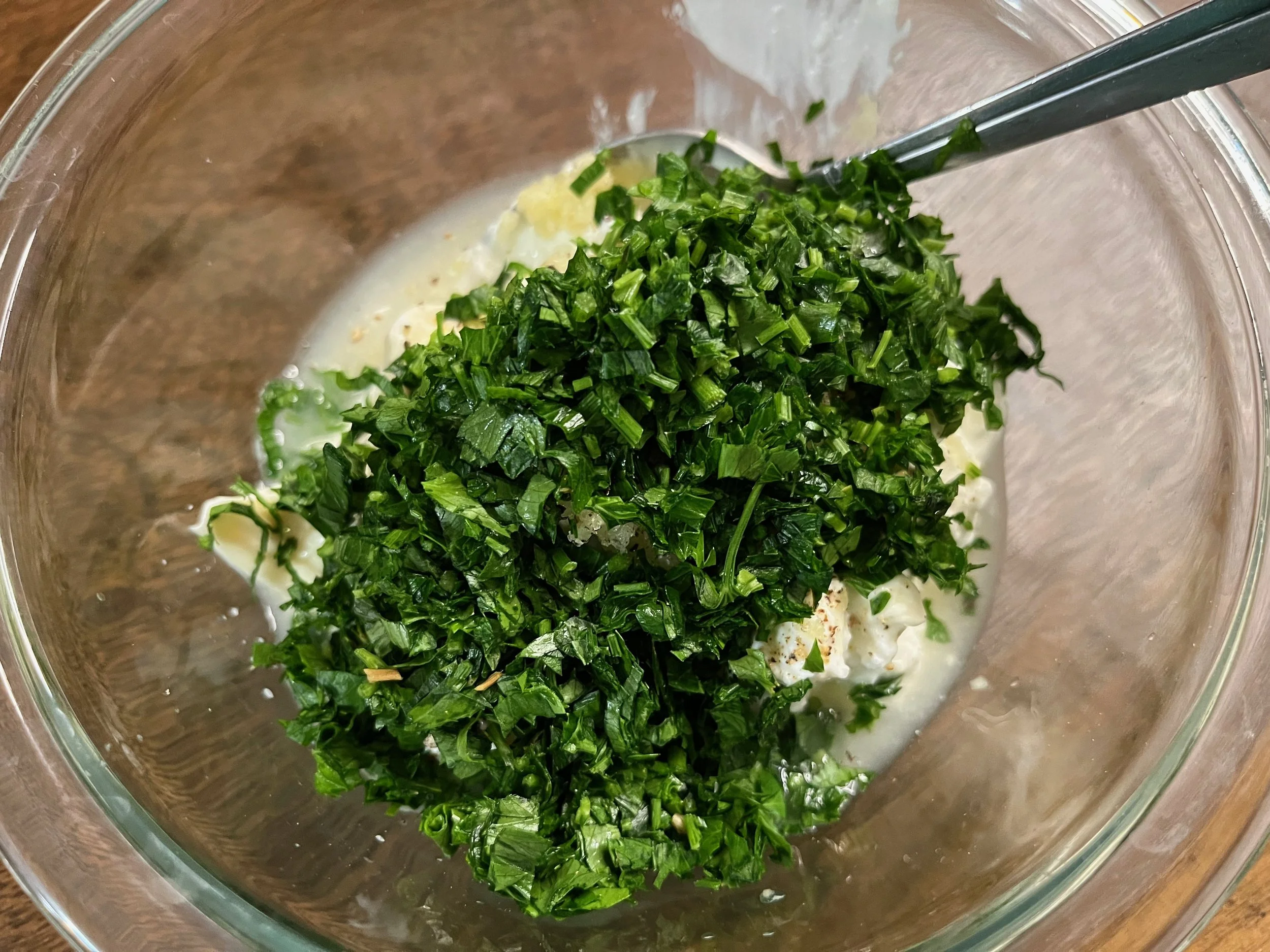 In a mixing bowl, combine the mayonnaise and the Greek yogurt [2]. The mayonnaise helps make the sauce smoother and creamier than it would be with yogurt alone. Add to the bowl the juice of half a lemon, together with the minced parsley, crushed garlic, and salt and black pepper to taste. Mix the ingredients together until smooth. We want the final consistency of the sauce to be easy to drizzle, similar to a thick salad dressing. However, depending on the type of yogurt you use, the thickness of the sauce may vary. If necessary, mix in some water to the sauce, about a teaspoon at a time, until you achieve the correct consistency.