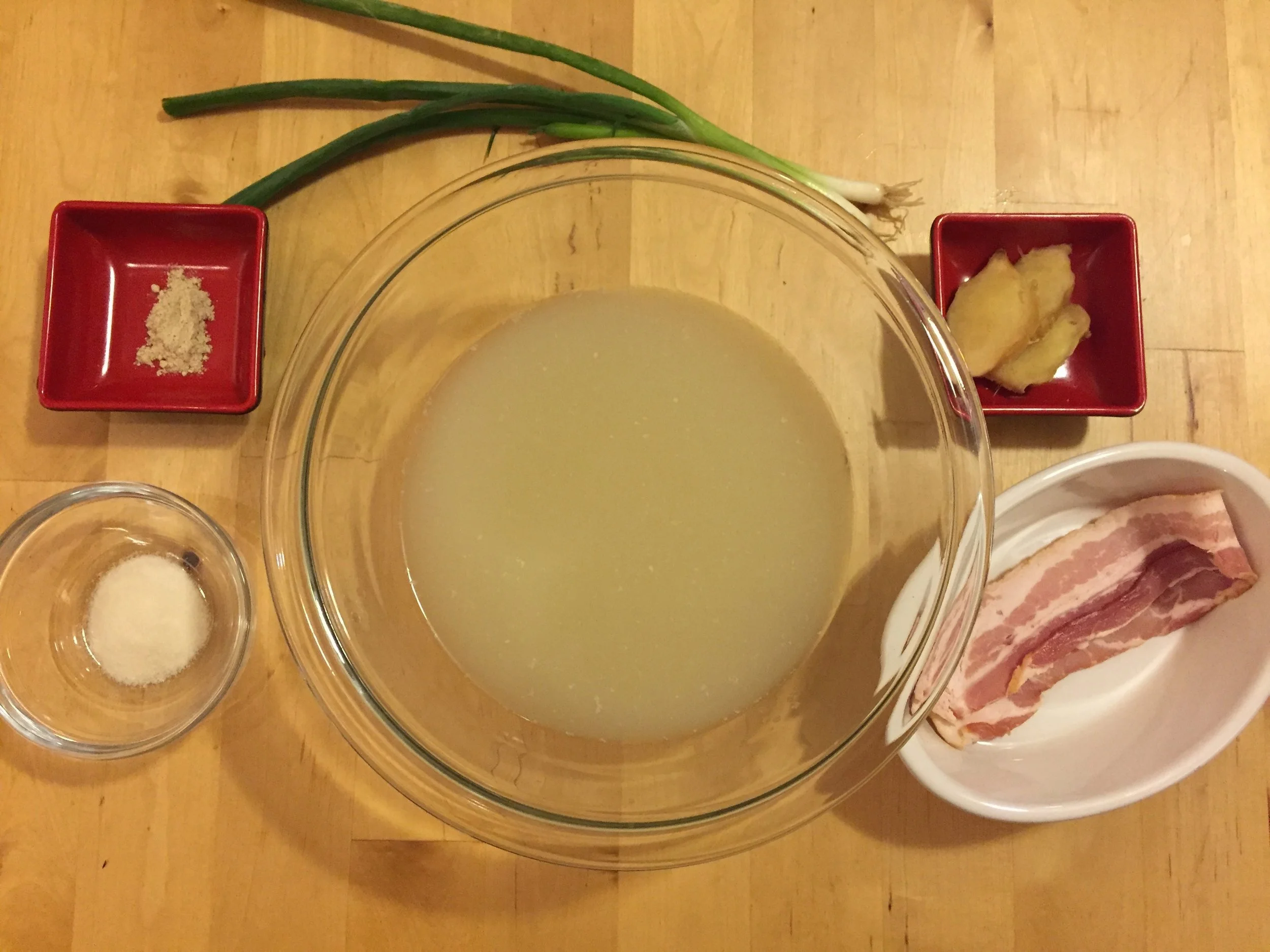 1. To make the concentrated soup, add 2 cups of stuck to a small pot, together with the diced bacon, scallion, ginger, and white pepper. Bring to a boil and simmer the soup for 20 minutes.