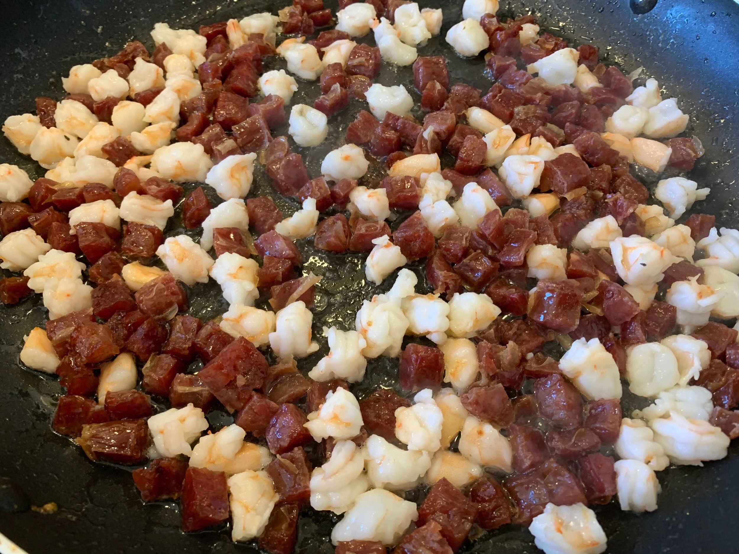 Round 1: pork and shrimp. Begin by adding the diced sausage or cured ham to a cold skillet, and turn the heat to low. Both of these products contain a fair amount of fat, which can be rendered to cook both itself and the shrimp. The rendered pork fat also will lend a wonderful flavor to the rice. After about 3 minutes, the pork will have rendered much of its fat. Turn the heat up to high and add the chopped shrimp to the skillet. Fry the shrimp and sausage for 2 minutes, tossing occasionally, until the shrimp is just cooked through. At that point, remove the shrimp and sausage from the heat. I like to use a large bowl to hold all of the cooked ingredients until they are ready to go back into the skillet.