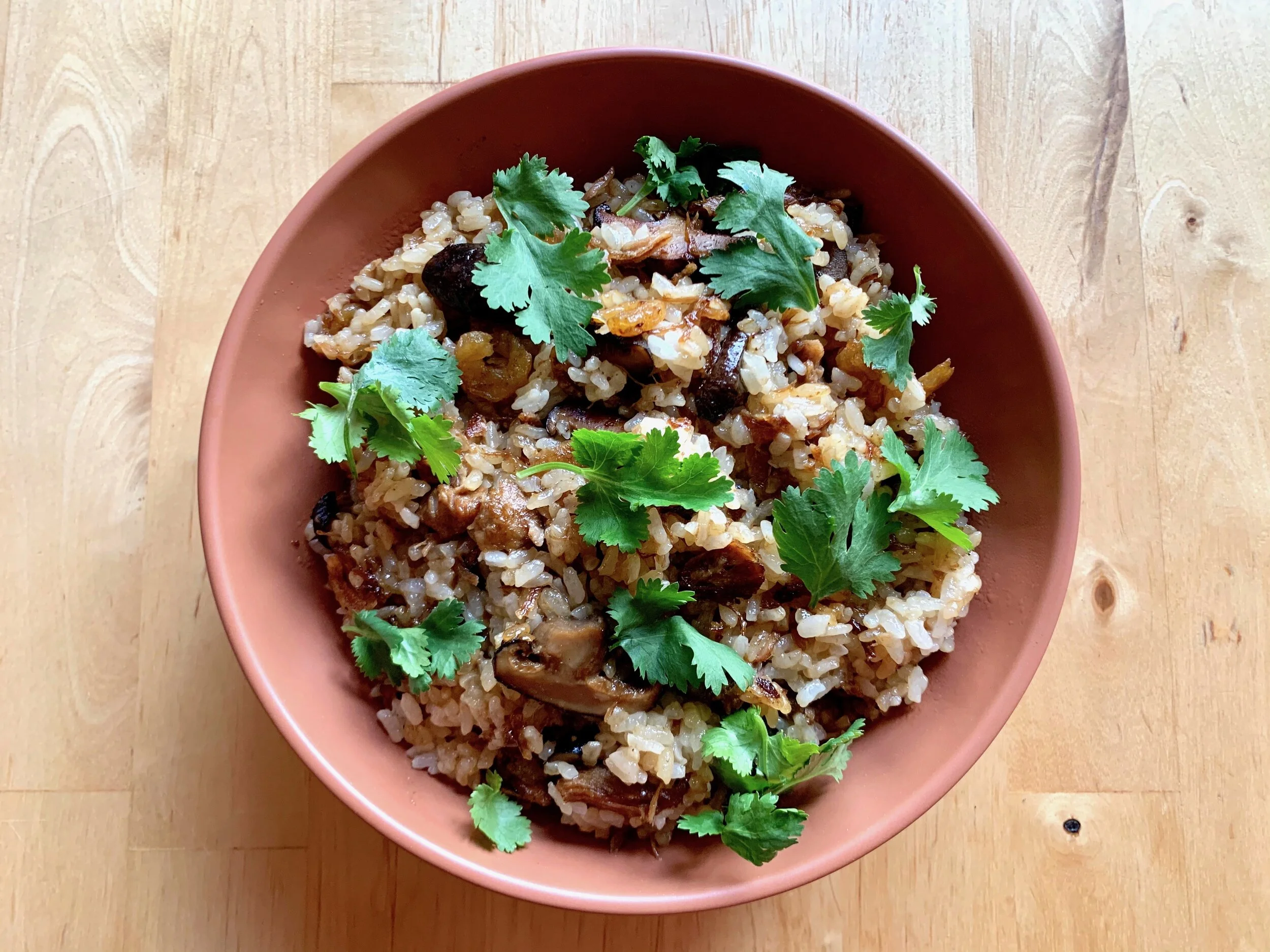 You fan (油飯) is the quintessential Taiwanese comfort food: a rich and savory sticky rice dish made with pork, mushrooms, dried shrimp, and fried shallots, and with a generous topping of fresh herbs.[1] You will often find a big bowl of this sticky rice served on festive occasions. Sticky rice is very straightforward to make—it is essentially a fried rice procedure, except with sticky rice instead of standard white rice. Here’s how to do it!